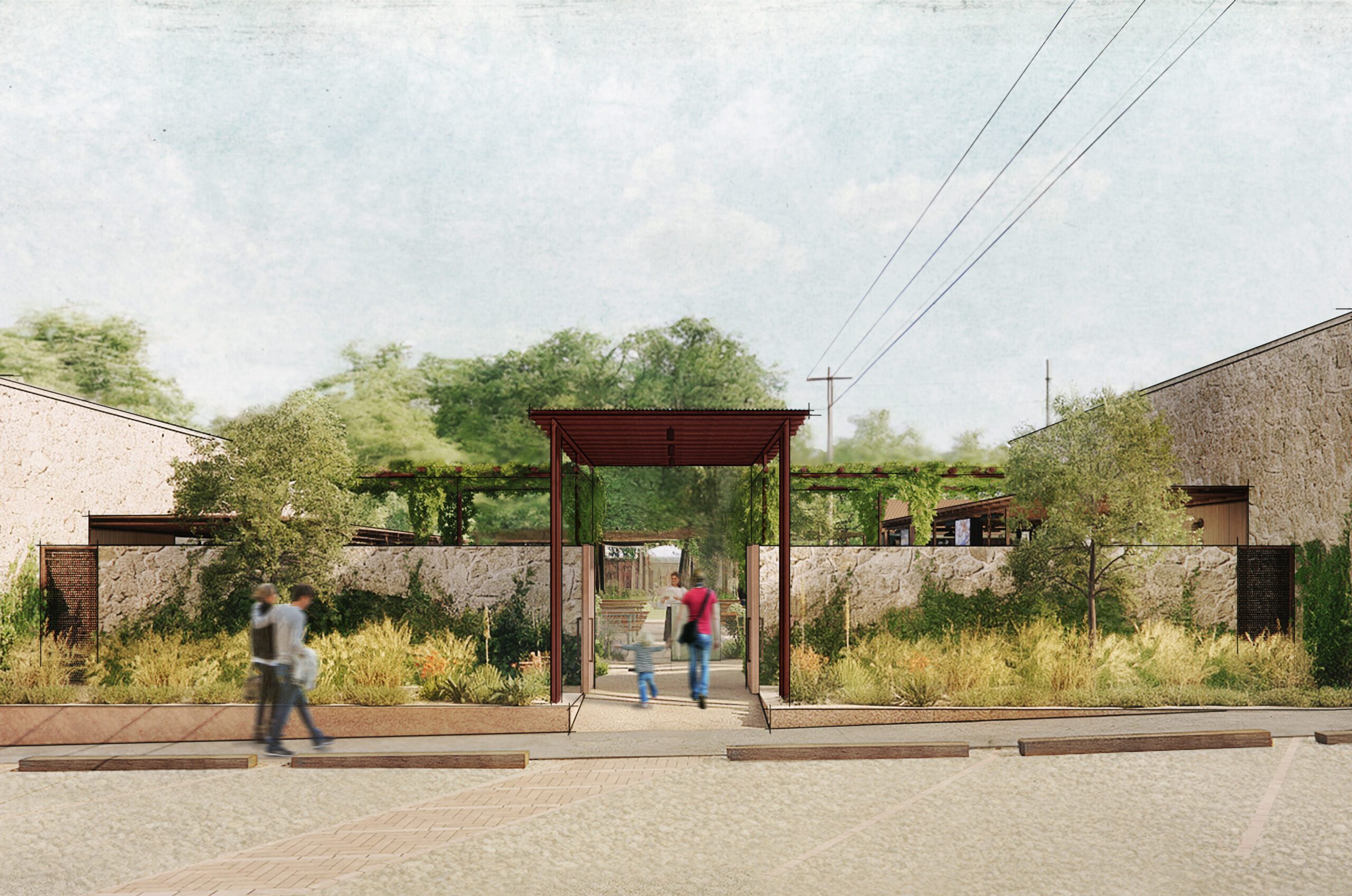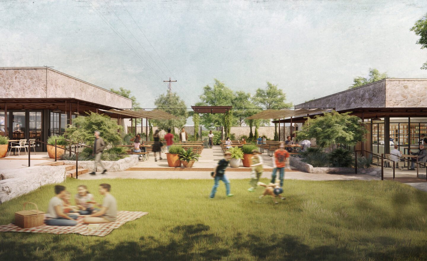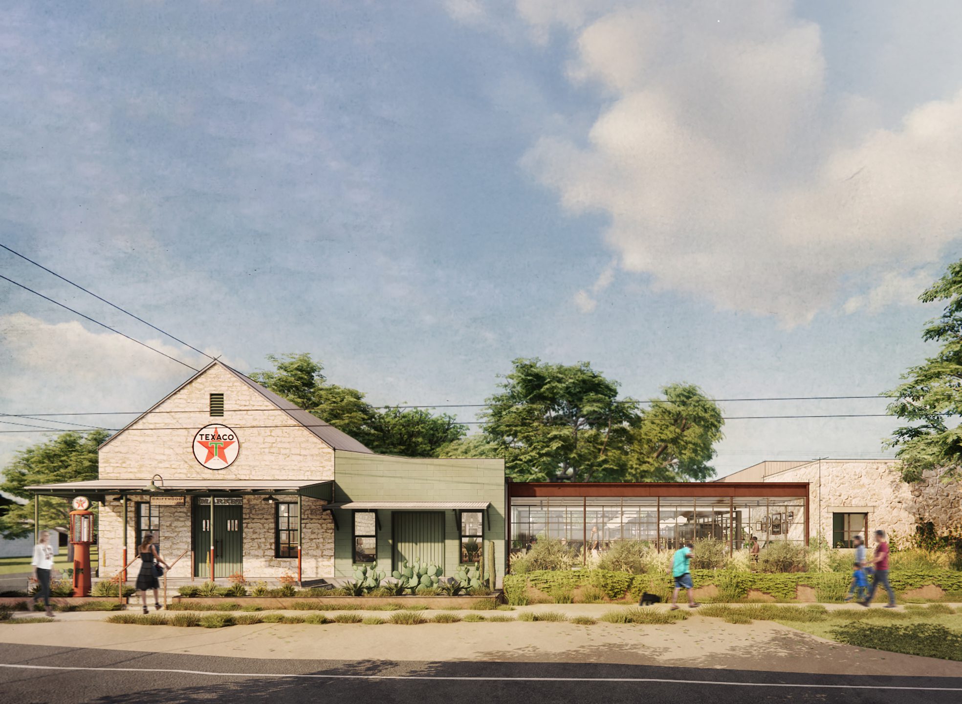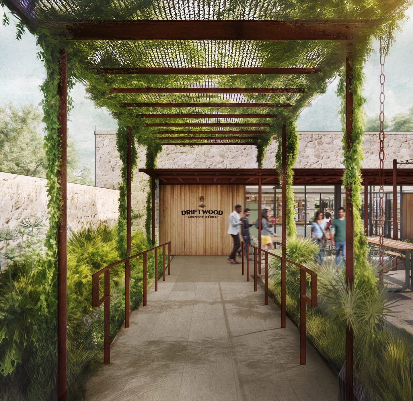 The Driftwood Store begins with what was already there. An old limestone building, once a small country gas station, and its neighboring one-story brick store anchor the corner. Three new buildings expand from these existing structures, arranged around an open courtyard where a central lawn, stage, and covered patio seating flow together. Native plants and mature trees are woven through the entire site, softening every edge between building and ground, pavement and lawn, structure and sky.