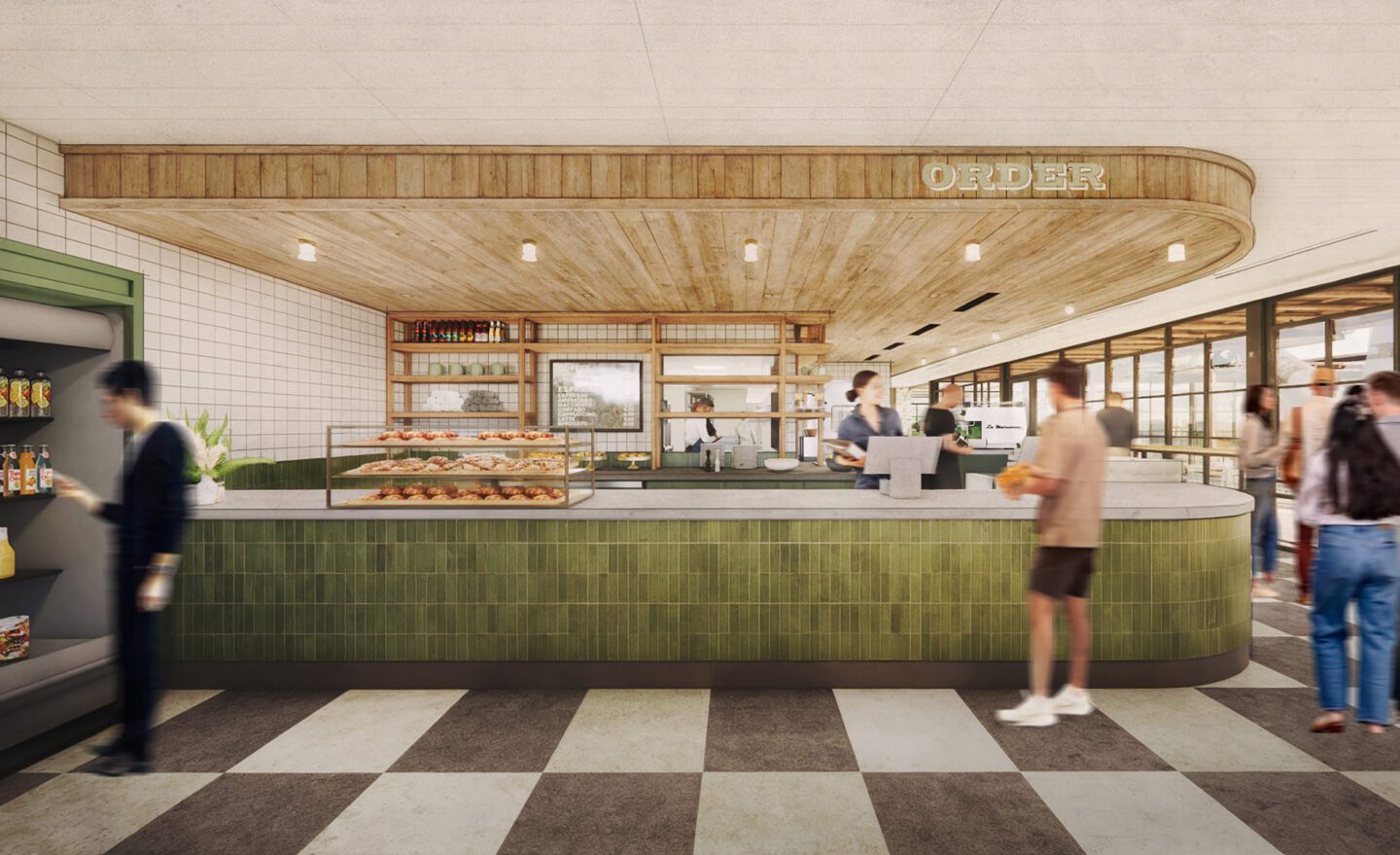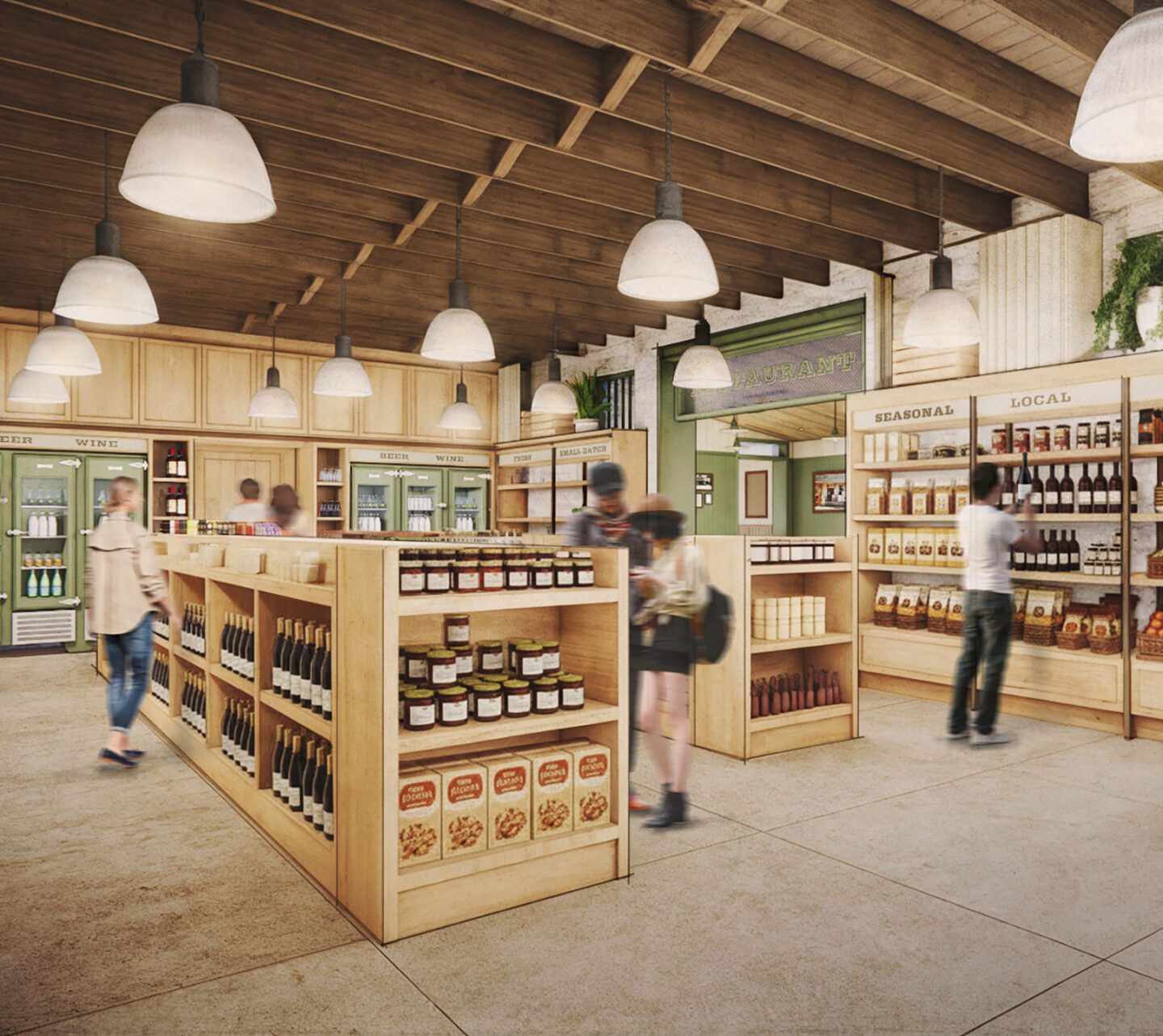 Inside, the choices are simple and deliberate. The cafe and deli counter curves in green tile, with soft white oak defining the millwork throughout the store. The large steel-framed windows keep the space in constant conversation with the terrace, courtyard, and plantings outside. The market occupies the original building, exposed timber rafters overhead and wood shelving below, organized around seasonal, regional, and local goods including beer, wine, and small-batch provisions. Color runs through it all in quiet doses of green. Every material is chosen not for how it looks when new, but for how it will settle in over time.