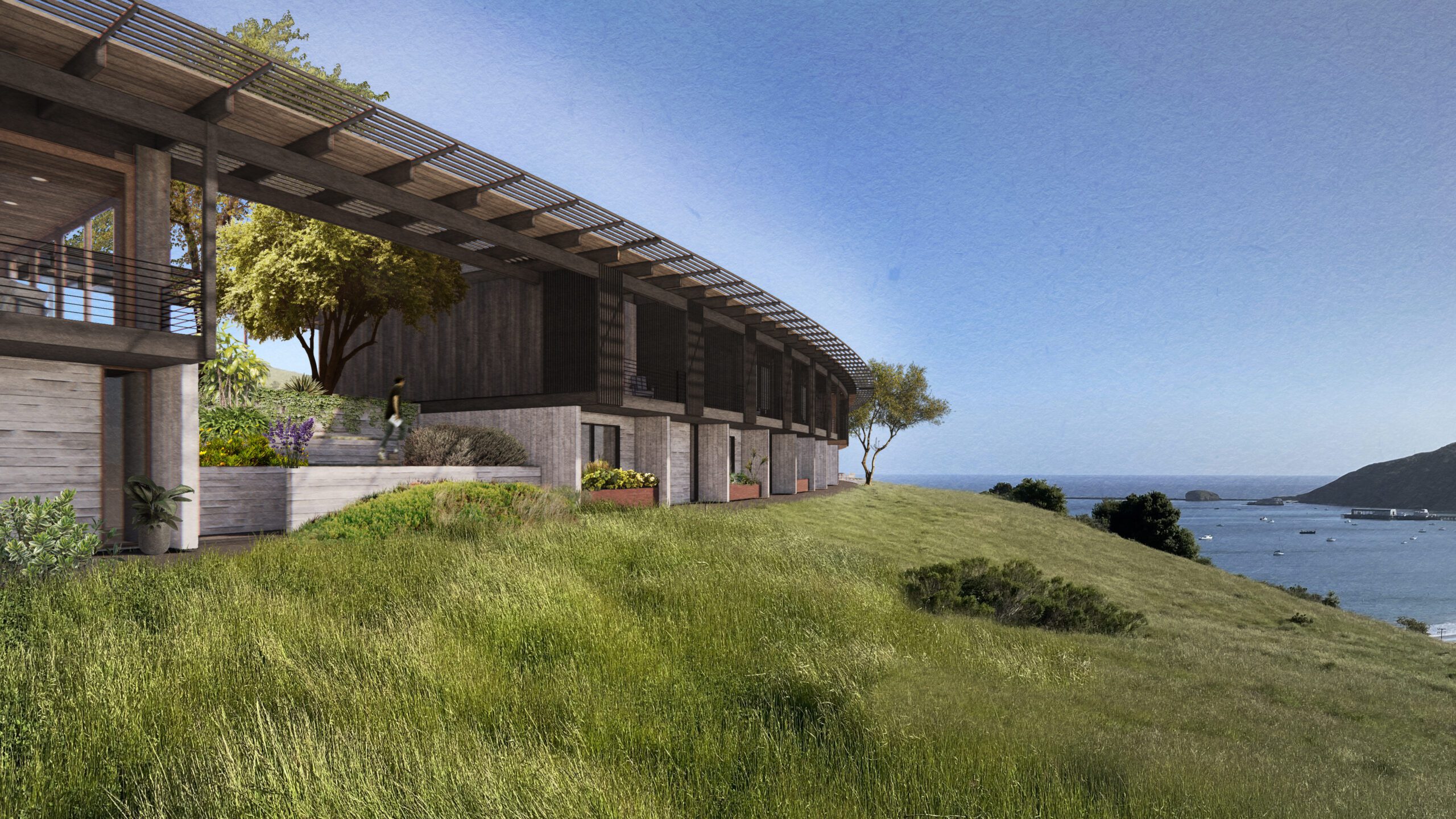 The retreat’s orientation maximizes oceanfront views and natural breezes, providing passive cooling while framing the stunning western and northern hills. Guest suites are arranged in terraced blocks, each featuring shared lounge spaces that foster a sense of community. Lush courtyards weave between them, offering serene, sheltered outdoor areas that align with the hillside’s natural drainage patterns.
