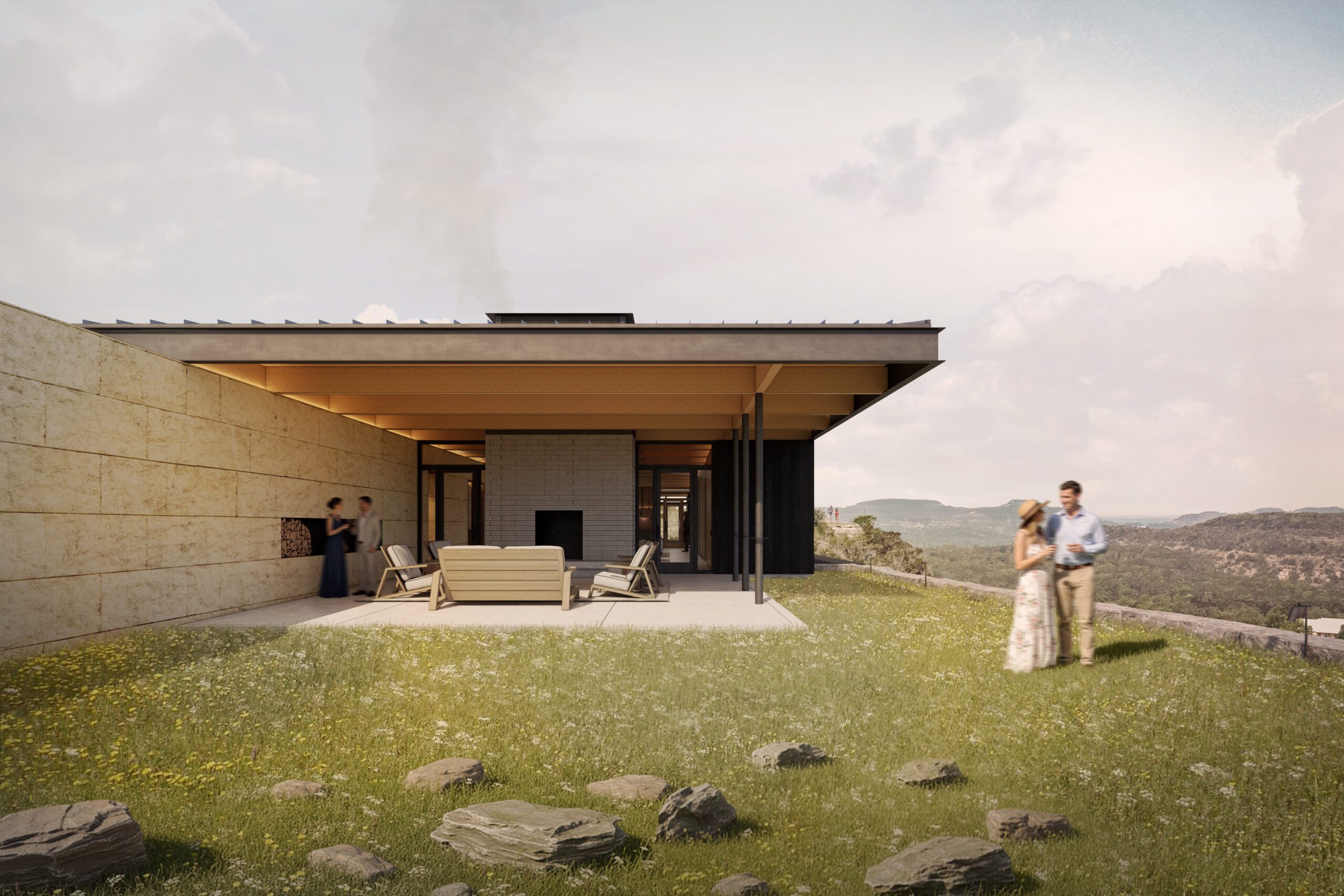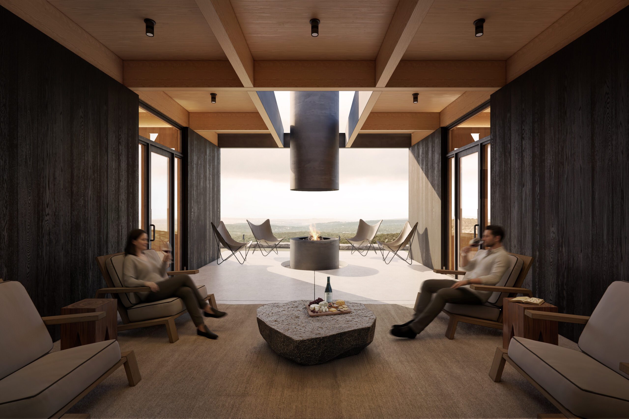 Materials were selected for their resilience, authenticity, and appropriateness to the Texas climate. Where the building connects to the earth, it is grounded in weight and permanence. Chopped limestone blocks—honed smooth on interior surfaces—define key transitions and structural cores. Surrounding these stone elements, lighter steel and wood framing articulate the more delicate and transitional spaces. The exterior is composed of exposed steel and shou sugi ban wood siding, a traditional Japanese method of charring wood to increase its durability and weather resistance. Inside, softer materials and warmer tones define the guest experience beneath an exposed wood structure that supports the roof.