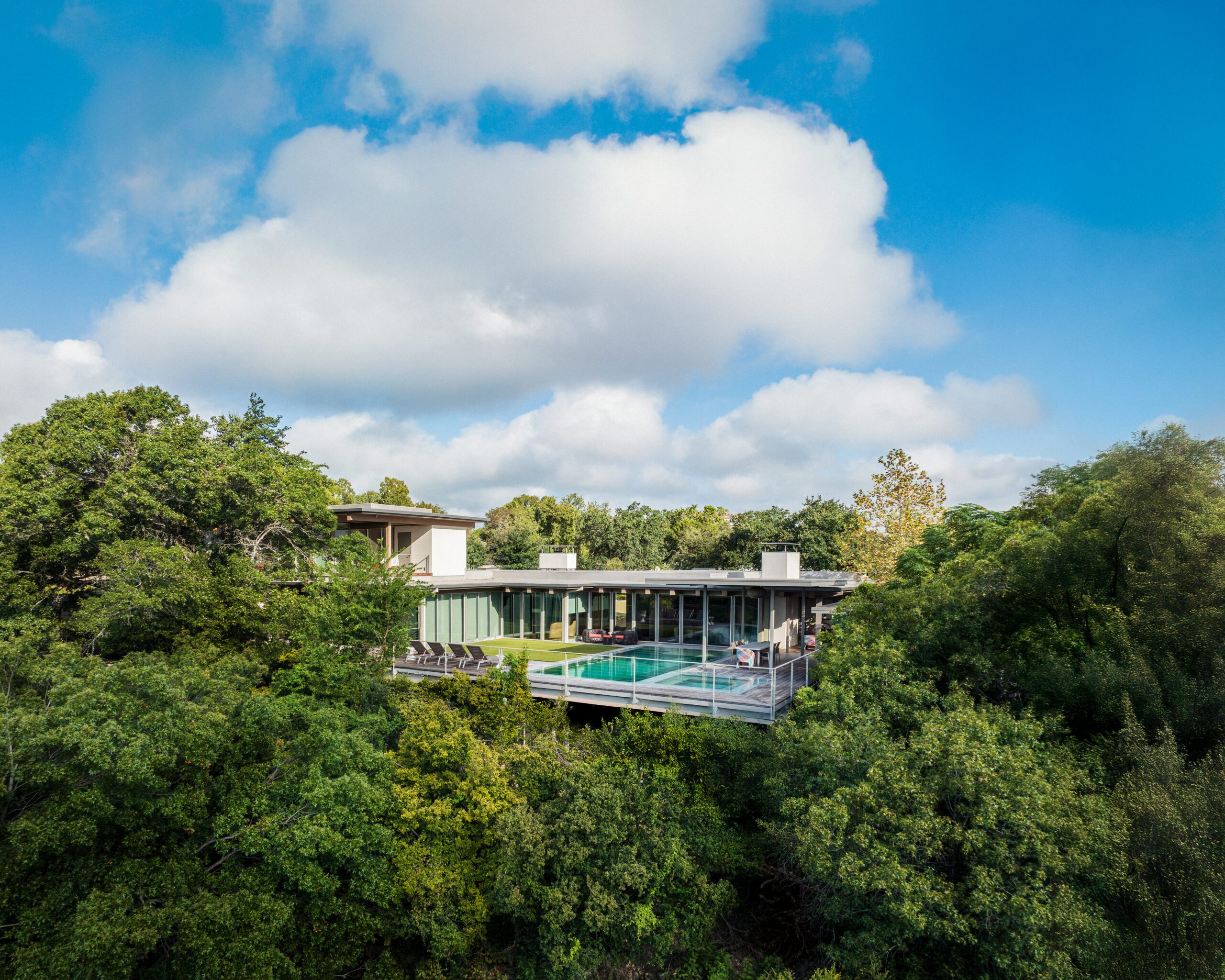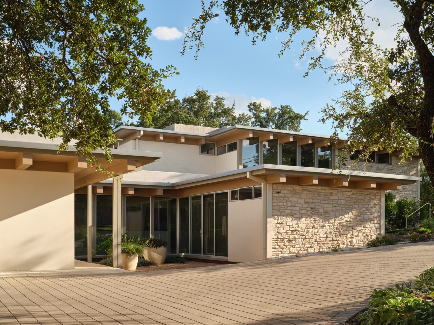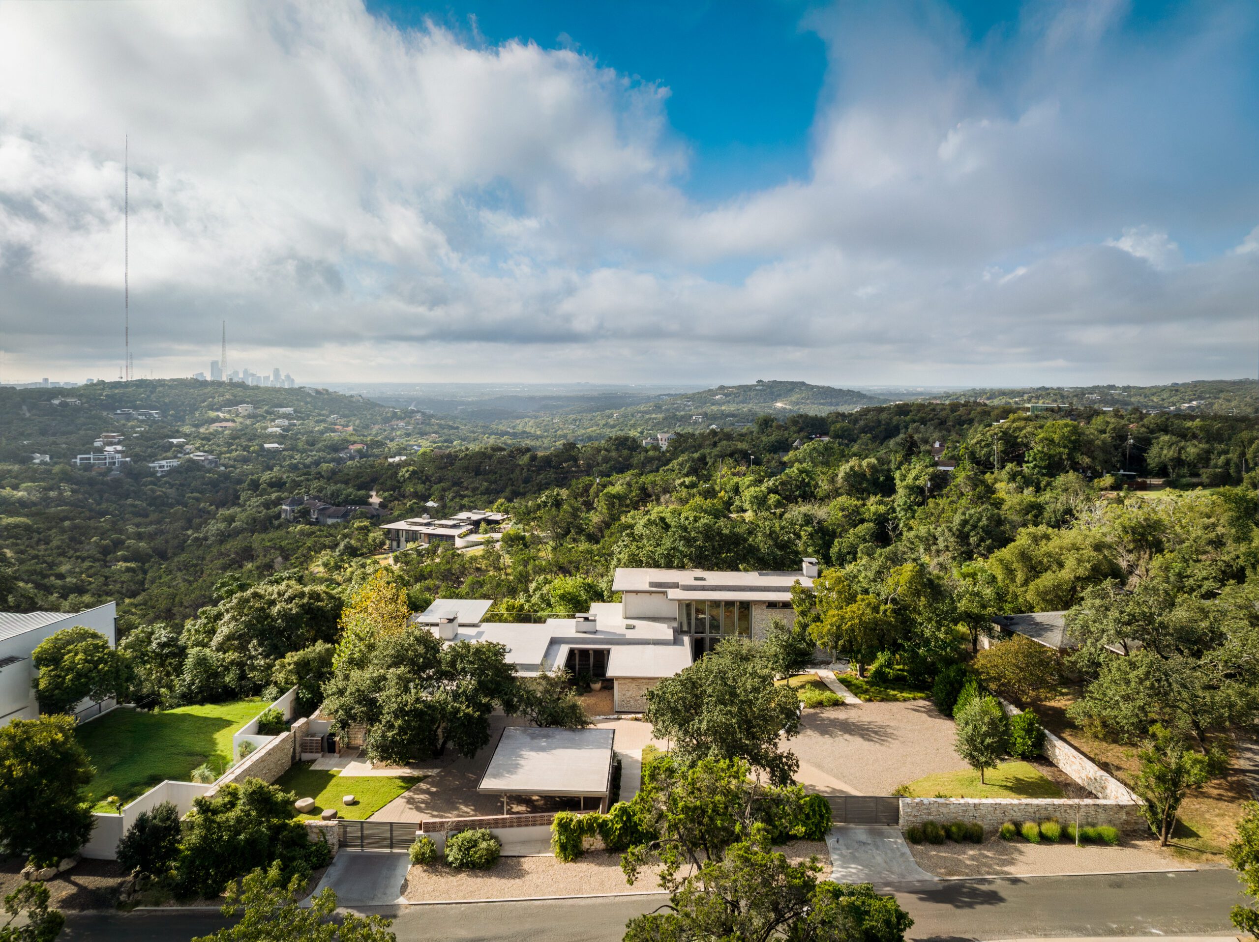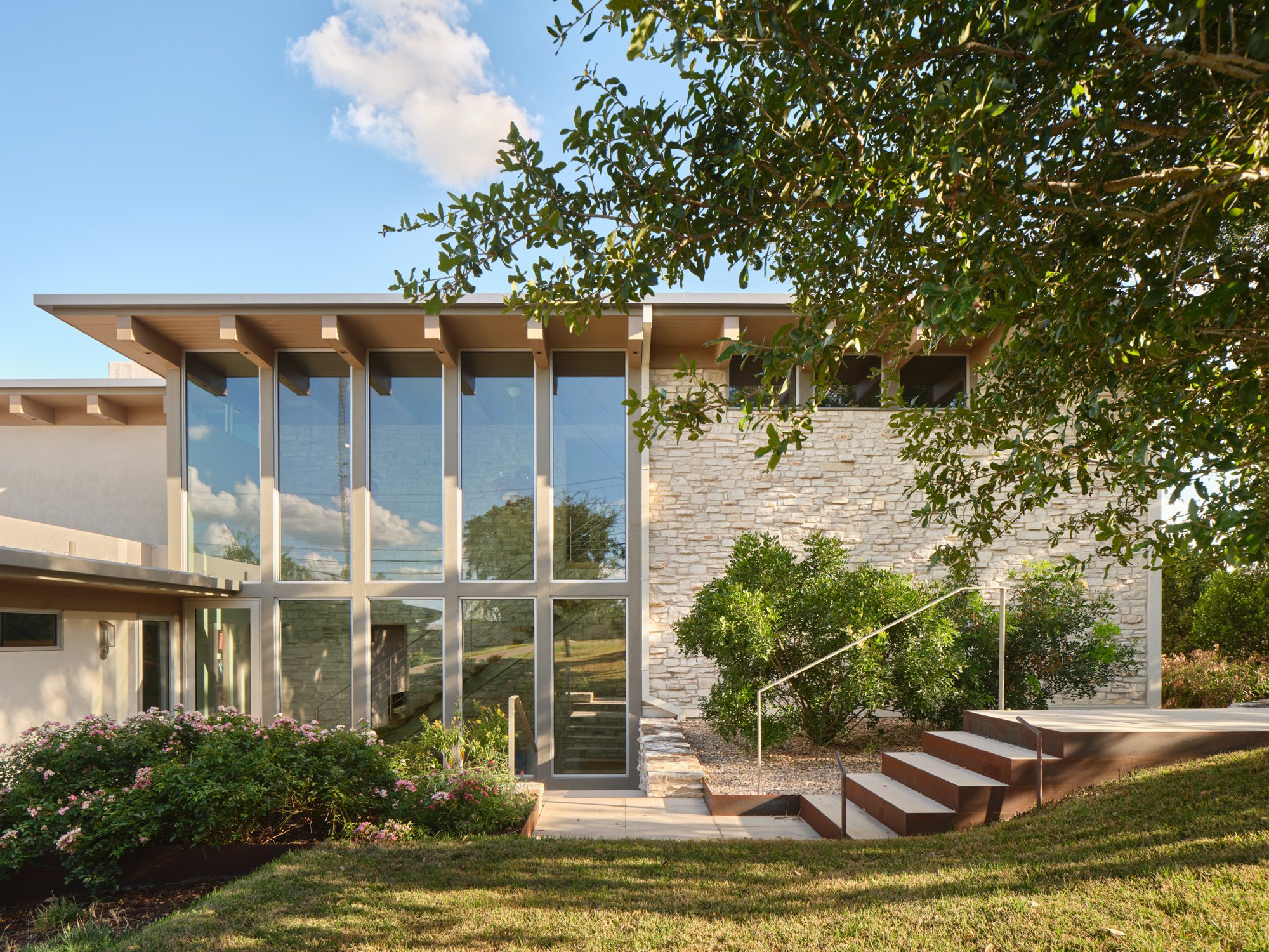 Perched on a hilltop in West Lake Hills with a peek of downtown Austin, the Ridgecrest Residence renovates and adds to a mid-century modern home. The 5,574 square-foot residence is designed to take advantage of the valley views and encourage seamless indoor and outdoor living experiences while using materials respectful of the place and details of the original home.