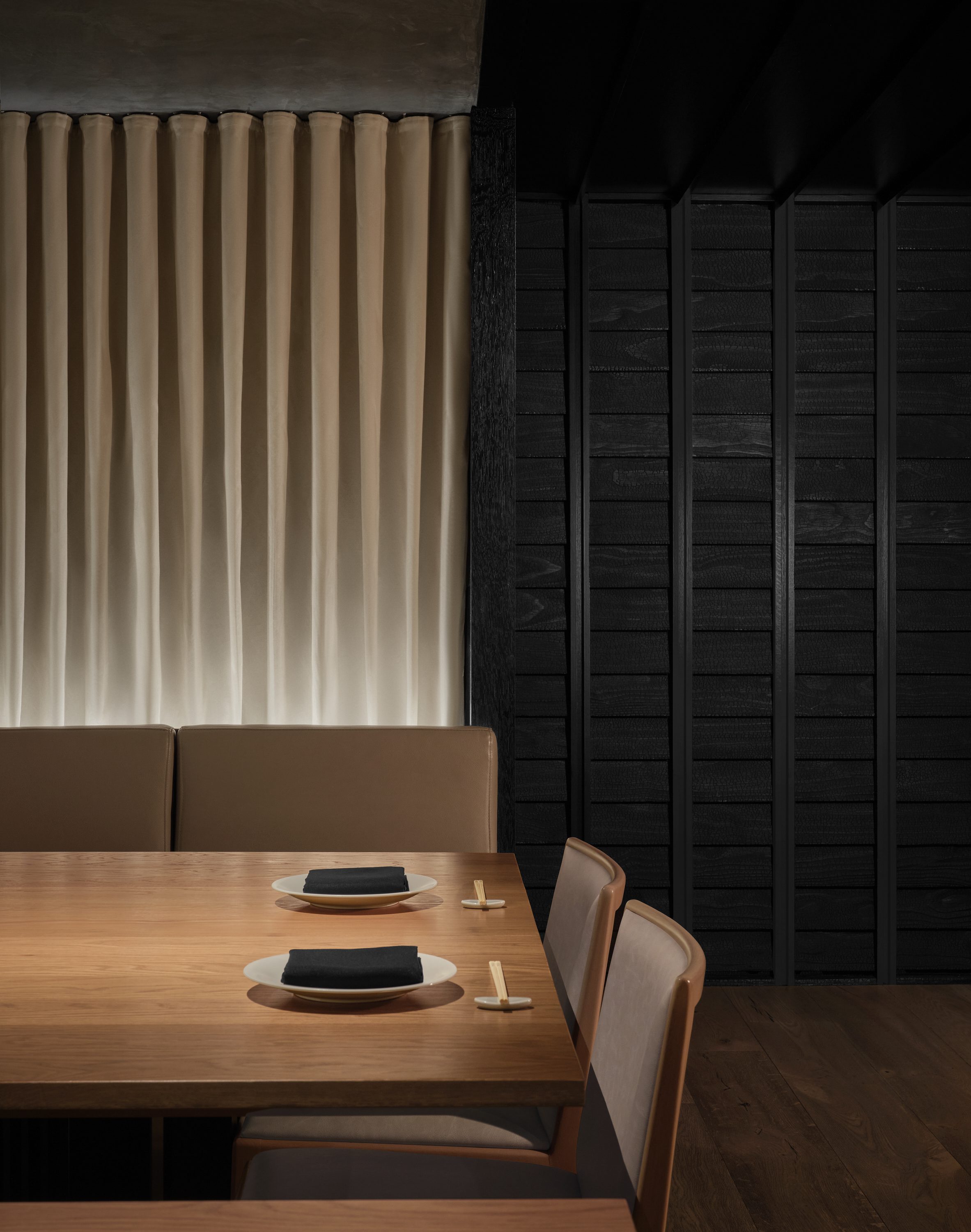 Perched beneath Aspen’s iconic mountain views and just steps from the gondola, this Japanese-inspired restaurant is an expression of refined elegance. A layered, tactile environment defined by warm woods and natural stone, the space uses clean lines and balanced proportions to evoke a sense of calm and harmony. Rooted in Japanese design ethos, the material palette features dark, monochromatic tones punctuated by lighter moments. Repetition of wood slats and rippling drapery introduces rhythm, while clear and ebonized oak, plaster, quartzite, and stone establish a serene backdrop for an exquisite culinary experience.